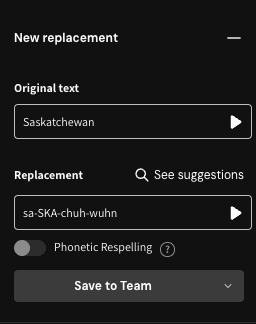For most workflows, we recommend creating respellings using the Replacements Panel in the right sidebar so pronunciations can be reused and managed centrally.