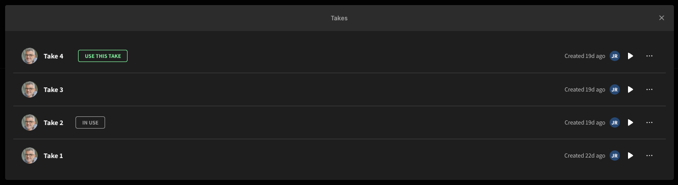 - A pop-up will appear listing every take you’ve rendered. Listen to the takes and click Use this take to repopulate the text for a particular take, then click anywhere outside the pop-up.