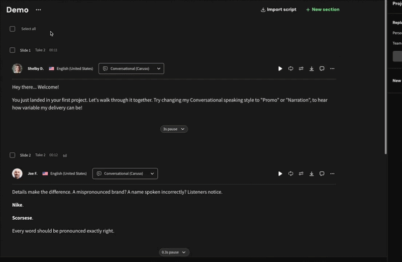 - Open your finalized English project in WellSaid Studio.